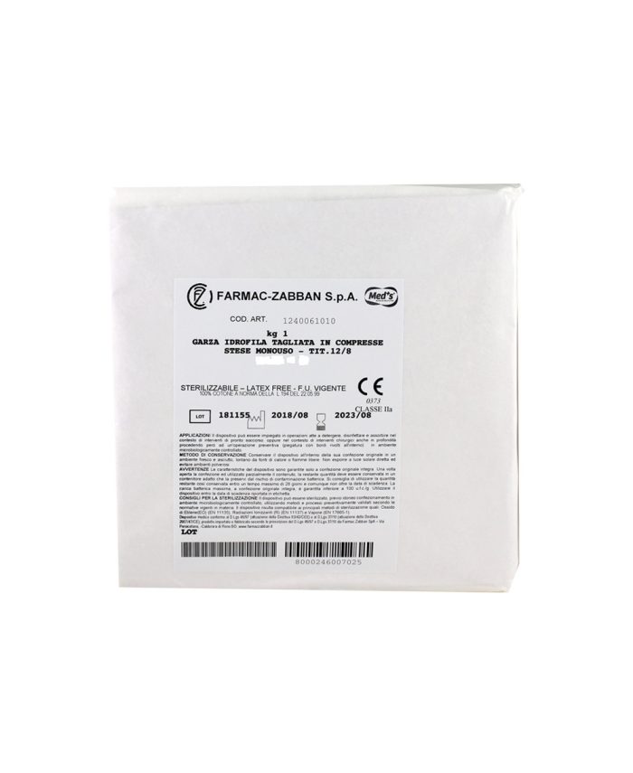 Garza idrofila 20×20 di puro cotone pretagliata e stesa.